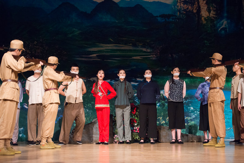 演出在一段磅礴大气、高亢激越的序曲中拉开序幕。“杜鹃花呀,杜鹃花呀,花开满坡,满山崖;心似火焰,红彤彤啊,身似白玉,玉无瑕……”清脆甜美的女声演唱贯穿全剧的主题歌《杜鹃花》,隐喻女主人公如杜鹃花般美丽的形象和坚毅刚强的性格特征。随着剧情铺展开来,为观众讲述了从刑场上死里逃生、克服亲人猜疑、被叛徒出卖、自发成立党小组与敌人顽强斗争,最终英勇就义等一个个感人至深的故事。六幕歌剧幕幕精彩,引人入胜,起伏跌宕的音乐和扣人心弦的剧情,把观众的思绪一次次带回激情似火的革命年代。音乐学院参演师生以饱满的精神、精湛的表演为大家倾情演绎了这段时代经典、红色记忆。