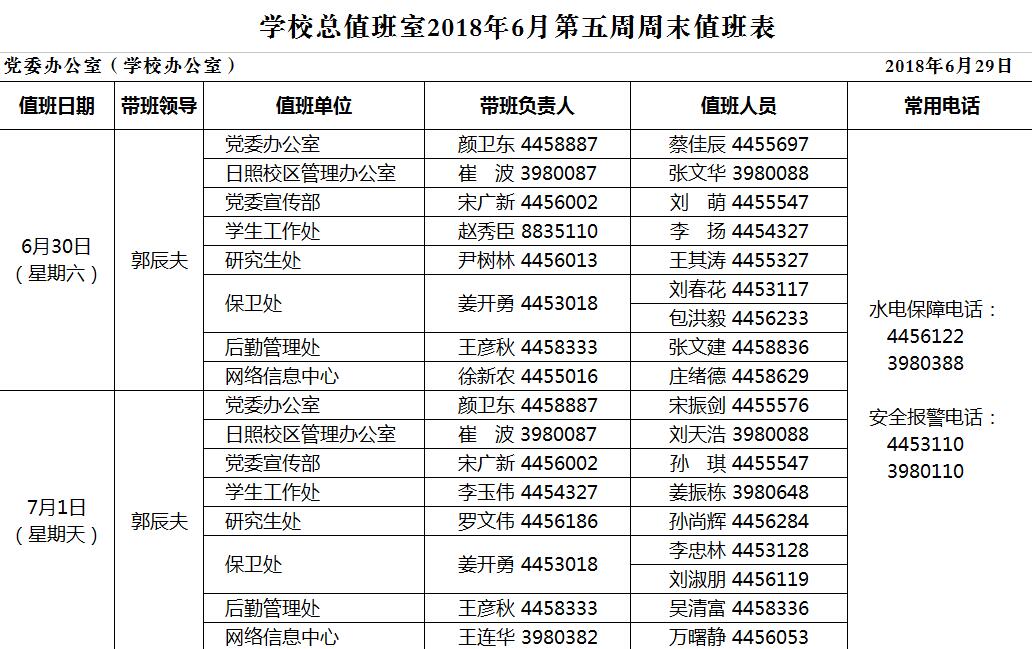 学校总值班室2018年6月第五周周末值班表