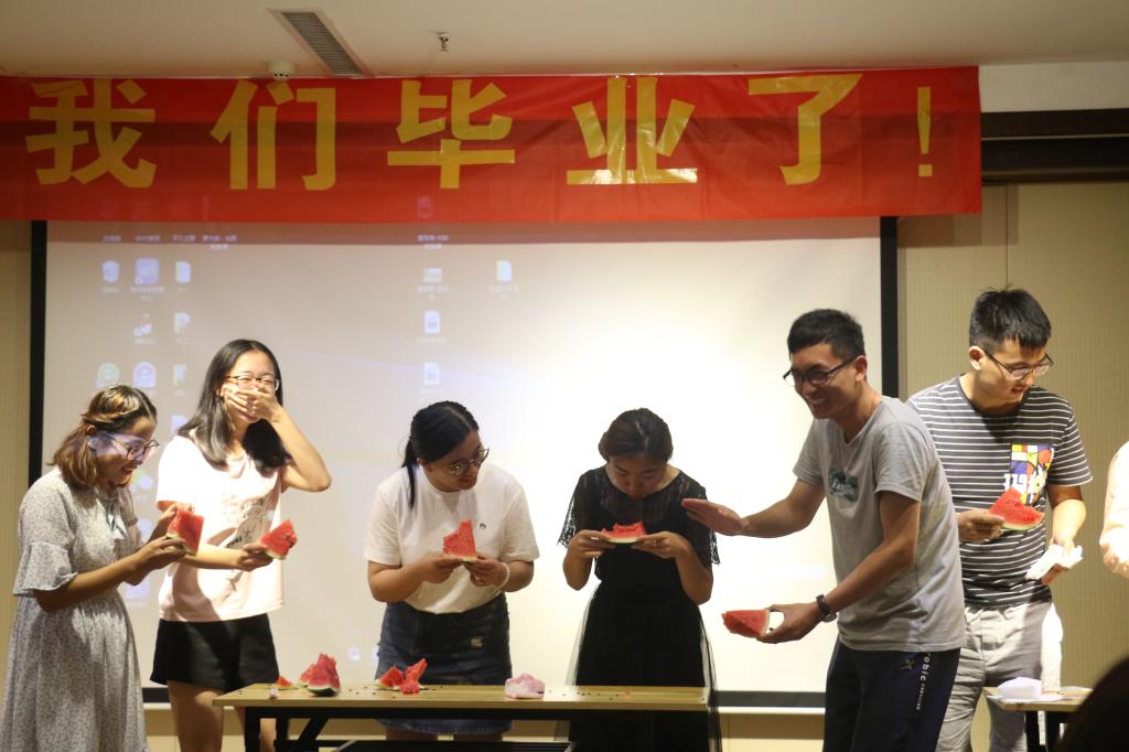 现场还设置了踩气球、吃西瓜比赛游戏环节,师生互动频繁,再次将活动推向高潮。15、16、17级同学为毕业生献上了动情的歌声和精彩的相声表演,表达了对师哥师姐真挚的祝福。卢瑞霞和赵谦为毕业生带来诗朗诵,与毕业生一一握手道别,活动在毕业生大合唱《当》中画上圆满的句号。