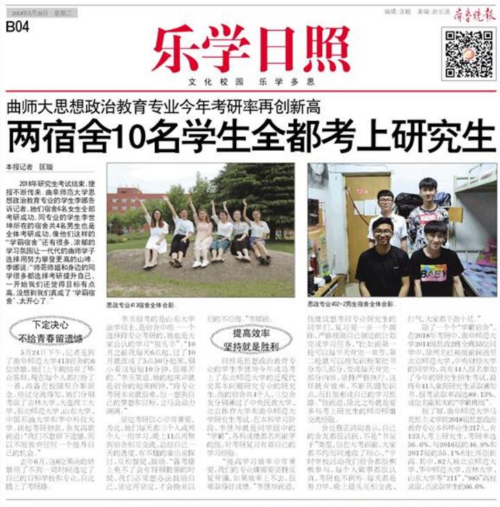 齐鲁晚报:曲师大思想政治教育专业考研率创新高